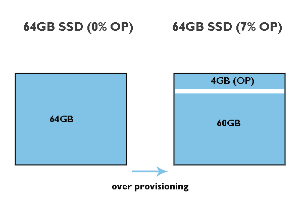 예를 들어 64GB SSD 중 60GB를 가용 용량으로 사용할 경우 4GB를 OP에 할당하고 OP(%)는 약 7%이다.