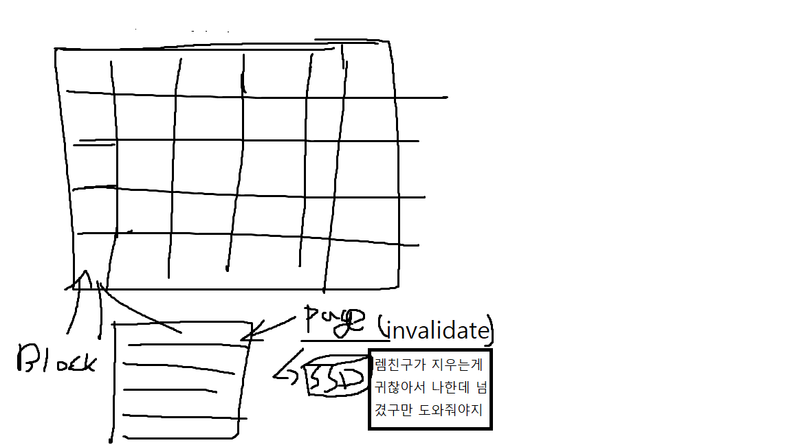요기 페이지에다가 쓰기작업을 하긴 하는데 지울떄는 하드웨어 한계상 블록단위로 지워야댐
